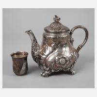 um 1930, Kanne gestempelt 800, Halbmond, Krone, Herstellermarke Wilkens & Söhne Hemelingen, Vertriebsstempel G.F. Gütig, Modellnummer 111881, in Barockform mit stark reliefierten Blüten, auf eingerollten Füßen stehend, Isolierscheiben aus Horn, rückseitig scharnierter Klappdeckel, dazu ein kleiner Becher in Schlangenhautoptik, gestempelt Halbmond, Krone, 835, Margraf & Co. Berlin, H 7 und 19 cm, G zusammen ca. 725,3 g.
