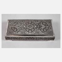 1. Hälfte 20. Jh., gestempelt 84 Zolotniki RAY, weitere Schriftzeichen, fein graviert, punziert und geschwärzt, innen vergoldet, flache Dose mit scharniertem Klappdeckel, orientalischer Dekor, guter Zustand, L 16 cm, G ca. 330,9 g.
