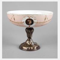 Silberstempel 925, Halbmond, Krone, Herstellermarke HW, gedreht gerippte Barockform, Anfang 20. Jh., Glasschale um 1860, diese ergänzt, Milchglas bunt bemalt und vergoldet, zwei Kartuschen mit Portraits, Fuß beschwert, Vergoldung am Rand stärker berieben, D 18 cm.