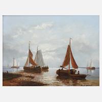 bei Flaute ihre Netze reparierende Fischer, bei bewölktem Himmel, Öl auf Holz, rechts unten signiert, in einem gekehlten Goldstuckrahmen gerahmt, dieser etwas trocknungsrissig, Falzmaß 17 x 23 cm, gesamt 33 x 39 cm. Künstlerinfo: geboren 28.07.1937, studierte in Paris und Den Haag.