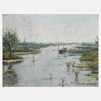 sommerliche niederländische Landschaft, mit Kahn auf Kanal, vor Stadtsilhouette, minimal pastose Malerei, Öl auf Platte, links unten datiert ”24./4. (19)38” und rechts unten signiert ”H. F. de Witt a/Hubeek”, rückseitig undeutliche Annotation mit ungeprüfter Zuschreibung ”Hendrick de Wit” und undeutlicher Provenienzangabe, reinigungsbedürftig, im Impressionistenrahmen gerahmt, Falzmaße ca. 19 x 23 cm.