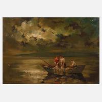 drei Fischer im Kahn, beim Einholen der Netze in der Morgendämmerung, pastose, impressionistische Malerei mit lockerem, breitem Pinselduktus in zurückhaltender Farbigkeit, Öl auf Papier und Hartfaserplatte, um 1970, links unten signiert ”Wohlrab”, ungerahmt, Maße 51 x 70,5 cm. Künstlerinfo: dt. Maler, Zeichner, Graphiker, Kunsthistoriker und Porzellandesigner (1905 Eger [Cheb] bis 1978 Nabburg/Oberpfalz), Sohn und Schüler des Dresdner Malers Karl Wohlrab (1873 bis nach 1930), studierte 1932–37 an der Akademie München bei Fritz Hellmut Ehmcke, Josef Hillerbrand und Meisterschüler von Constantin Gerhardinger, beschickte 1941–43 die Große Deutsche Kunstausstellung im Haus der Deutschen Kunst München, bis 1945 in Eger ansässig, später tätig in Breitbrunn am Chiemsee, Samerberg und Frankfurt am Main, ab 1961 in Amberg, in den 1950er Jahren als Porzellandesigner für die Kunstabteilung der Porzellanmanufaktur Rosenthal in Selb tätig, Quelle: Glassl-Schreiner ”Kunst in Eger – Stadt und Land” und Internet.