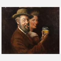 Bildnis eines älteren grauhaarigen, bärtigen Mannes, mit Zigarre, Hut und Weinglas (wohl Selbstbildnis des Malers) im Profil und einer jungen, über die Schulter blickenden Frau, vor dunklem Grund, minimal pastose, impressionistische Malerei, Öl auf Hartfaserplatte, um 1970, rechts unten signiert ”Wohlrab”, etwas restaurierungsbedürftig, ungerahmt, Maße ca. 65 x 80,5 cm. Künstlerinfo: dt. Maler, Zeichner, Graphiker, Kunsthistoriker und Porzellandesigner (1905 Eger [Cheb] bis 1978 Nabburg/Oberpfalz), Sohn und Schüler des Dresdener Malers Karl Wohlrab (1873 bis nach 1930), studierte 1932–37 an der Akademie München bei Fritz Hellmut Ehmcke, Josef Hillerbrand und Meisterschüler von Constantin Gerhardinger, beschickte 1941–43 die Große Deutsche Kunstausstellung im Haus der Deutschen Kunst München, bis 1945 in Eger ansässig, später tätig in Breitbrunn am Chiemsee, Samerberg und Frankfurt am Main, ab 1961 in Amberg, in den 1950er Jahren als Porzellandesigner für die Kunstabteilung der Porzellanmanufaktur Rosenthal in Selb tätig, Quelle: Glassl-Schreiner ”Kunst in Eger – Stadt und Land” und Internet.