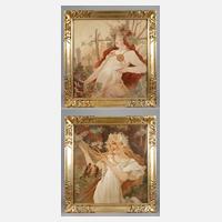 zwei dekorative Jugendstilmotive, junges blondes Mädchen mit Blütenkranz im Haar, vor blühendem Baum, im Angesicht einer Vogelschaar eine Harfe spielend, als Allegorie des Frühlings, dazu Pendant eines rothaarigen Mädchens bei der Weinernte, als Allegorie des Herbstes, lasierende Dekorationsmalerei nach Motiven von Alfons Mucha (1860–1939), Öl auf Leinwand, 20. Jh., unsigniert, je wachsdoubliert und restauriert, als Pendants im sehr schönen Goldstuckrahmen gerahmt, Falzmaße je ca. 70 x 70 cm.