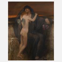 trauernde, schwarz verschleierte Frauengestalt vor karger herbstlicher Landschaft in der Abenddämmerung, von Psyche getröstet, lasierende, allegorische Malerei in zurückhaltender Farbigkeit, Öl auf Leinwand, um 1890, rechts unten monogrammiert ”C.W.”, restauriert, schön gerahmt, Falzmaße ca. 117 x 95,5 cm.