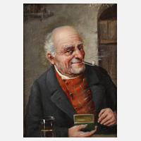 Brustbildnis eines verschmitzt ein Pfeifchen rauchenden Alten, lasierende Genremalerei, Öl auf Holz, rechts oben undeutlich ritzsigniert ”J. Milotta?” und datiert 1901, gerahmt, Falzmaße ca. 16 x 12 cm.