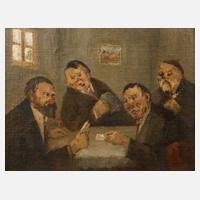 vier Männer im dämmrigen Interieur beim Kartenspiel, minimal pastose, karikaturhafte Genremalerei in gedeckter Farbigkeit, Öl auf Malplatte, Mitte 20. Jh., links unten undeutlich signiert, rückseitig Studie eines Damenaktes, gerahmt, Falzmaße ca. 21 x 27 cm.