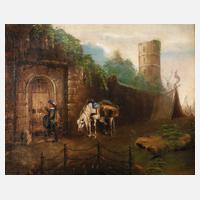historisierende Szene, mit Boten am Tor einer Burgruine mit Zeltlager, lasierende, teils minimal pastose Genremalerei, Öl auf Leinwand, um 1900, rechts unten undeutlich signiert, geringe Altersspuren, im goldbronzierten Stuckrahmen gerahmt, Falzmaß ca. 38 x 47 cm.