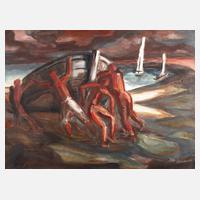Meeresstrand im abendlichen Licht, mit Personen, ein Fischerboot zu Wasser lassend, expressive, minimal pastose Malerei mit breitem Pinselduktus, Öl auf Hartfaser, rechts unten unleserlich signiert ”Inn .....” und datiert ”(19)54”, stammt vom selben Künstler wie vorhergehende Position, schön gerahmt, Falzmaße ca. 90 x 120 cm.