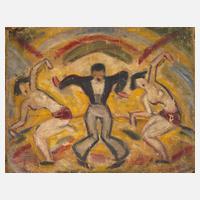 Tänzer mit zwei spärlich bekleideten Tänzerinnen beim Charleston, vor farbenfroher Kulisse, seltenes Sujet in avantgardistischer Wiedergabe, expressive, pastose Malerei mit breitem Pinselduktus, Öl auf Leinwand, 1920er Jahre, alt vom Keilrahmen gelöst, rechts unten undeutbare Signaturreste, rückseitig unleserlicher runder Stempel, Fehlstellen in der Leinwand, Malschichtverluste, restaurierungsbedürftig, ungerahmt, gerollt, Bildmaße ca. 55 x 65 cm.