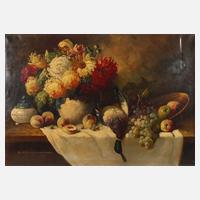 stimmungsvolles Arrangement mit erlegter Ente sowie Dahlienstrauß neben Pfirsichen, Äpfeln und Weintrauben auf weißem Tuch, minimal pastose Stilllebenmalerei mit lockerem, breitem Pinselduktus, Öl auf Leinwand und Keilrahmen, 1. Hälfte 20. Jh., links unten undeutlich signiert, doubliert, reparierte Fehlstelle in der Leinwand, etwas restaurierungsbedürftig, ungerahmt, Maße ca. 71 x 101 cm.