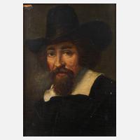 dunkel gekleideter älterer Herr, mit Kinnbart und Hut, dem Betrachter entgegenblickend, farblich fein differenzierte Portraitmalerei im Stil der niederländischen Meister, Öl auf Sperrholz, 1. Hälfte 20. Jh., unsigniert, retuschiert, gleichmäßige Craquelure, oben links Fehlstelle, restaurierungsbedürftig, gerahmt, Falzmaß ca. 23 x 17,5 cm.