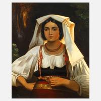 Halbfigurenbildnis einer rassigen jungen Frau in Tracht, vor Weinreben, minimal pastose Bildnismalerei in kraftvoller Farbigkeit, Öl auf Leinwand, um 1900, unsigniert, Craquelure, restauriert, Fehlstelle in der Leinwand, etwas restaurierungsbedürftig, gerahmt, Falzmaße ca. 85 x 70 cm.