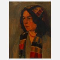 Brustbildnis einer rassigen jungen Frau mit langem dunklen Haar, farbenfrohem Schal und passender Mütze, im Halbprofil, vor grau-grünem Grund, lasierende Bildnisstudie, Öl auf Leinwand, 1. Hälfte 20. Jh., unsigniert, rückseitig auf der Leinwand unleserlich signiert, auf dem Keilrahmen teils unleserlich bezeichnet ”Rheinboldt Schüler von ...”, geringe Altersspuren, in Goldstuckleiste gerahmt, Falzmaße ca. 47,5 x 37,5 cm.