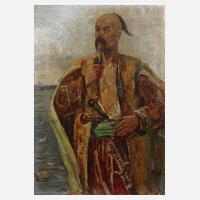 kahlhäuptiger Kämpfer mit Zopf und Schnurrbart, in volkstümlicher Tracht, mit in den Gürtel eingesteckten Messern, Öl auf grober Leinwand, rechts unten unleserlich signiert und datiert (19)43, auf Keilrahmen gerahmt, Altersmängel (wellig), Gesamtmaß 46 x 33 cm.