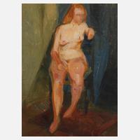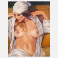 Halbfigurenbildnis einer sich entkleidenden jungen Frau, lasierende Aktmalerei, Öl auf Leinwand und Keilrahmen, rechts unten undeutlich signiert und datiert ”Wi Hensch? (19)70”, ungerahmt, Maße ca. 50 x 40 cm.