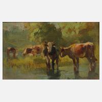 Knabe in der Abenddämmerung, beim Tränken zweier Pferde am Fluss, pastose Malerei mit breitem Pinselduktus in zurückhaltender Farbigkeit, Öl auf Karton, um 1900, unsigniert, rückseitig getilgte Annotationen, gerahmt, Falzmaße ca. 15,5 x 22,5 cm.