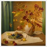 bunt verfärbte Ahornzweige, in bauchiger Porzellanvase, neben Teller mit Weintrauben und Äpfeln auf Tischtuch, im lichten Interieur, fein lasierende, neusachliche Stilllebenmalerei, Öl auf Leinwand und Sperrholz, rechts unten undeutlich monogrammiert und datiert ”Sa (19)44”, Craquelure, frühschwundrissig, reinigungsbedürftig, ungerahmt, Maße ca. 130 x 130 cm.