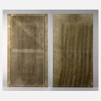 monochromer Farbauftrag und Applikationen auf grüner Leinwand, verso mit Filzstift signiert und datiert (19)74, Leinwandstempel Göteborg, auf Holzrahmen getackert und genagelt, Gesamtmaß je 121 x 66 cm. Künstlerinfo: deutscher Vertreter der Analytischen Malerei (1941 Tapiau bis 2016 Hückeswagen).