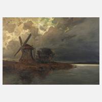 romantisch erfasste Abenddämmerung, mit Blick auf eine Landzunge mit Mühle, Öl auf Leinwand, rechts unten signiert, in einer breiten schwarzen Lackleiste mit goldener Innenleiste gerahmt, eine alt hinterklebte Stelle, Leiste etwas restaurierungsbedürftig, Falzmaß 70 x 98 cm, gesamt 98 x 126 cm. Künstlerinfo: deutscher Landschaftsmaler (1870 Berlin bis 1951 ebda.).