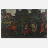 abendliche Sommerlandschaft, mit Bauern auf dem Nachhauseweg, expressive, stark pastose Malerei mit breitem Pinselduktus, in gedecktem Kolorit, mit wenigen leuchtenden Farbakzenten, hierzu bemerkt AKL ”Bertelsson malte vor allem aus der Erinnerung. Das trifft bereits für Werke von 1933 zu ... Diese zeichnen sich zunächst durch eine zurückhaltendere Farbigkeit aus ... Mehr Leuchtkraft besitzen größere Gruppenbilder zu religiös-sozialen Themen (Erntebauern; Ländlicher Feierabend) und die südlichen Landschaften.” und Vollmer ergänzt ”Bedeutender Kolorist, der expressionistischen Richtung sich nähernd.”, Öl auf Leinwand, auf Keilrahmen aufgespannt, wohl eines der wenigen erhaltenen Frühwerke vor 1933, unsigniert, rückseitig auf dem Keilrahmen bezeichnet ”A. Bertelson – Erntezeit”, Craquelure, Wachsdoublierung in der Fläche gelöst und bis auf Randbereiche entfernt, etwas restaurierungsbedürftig, ungerahmt, Maße ca. 95 x 143,5 cm. Künstlerinfo: auch Alexander Bertelson, dt.-russischer Maler, Gebrauchsgraphiker und Kunstschriftsteller (1890 Lixna bei Dünaburg/Witebsk bis 1975 Berlin), Schüler der Kunstschule Riga, studierte ab 1910 an der Akademie München, hier Meisterschüler von Heinrich von Zügel, ab ca. 1912 Weiterbildung in Dresden bei Wilhelm Claus, beschickte ab 1913 Ausstellungen in Riga, ab 1914 in Schweden tätig, 1920 Gründer der expressionistischen Dresdner Künstlergruppe ”Die Schaffenden”, 1922 Bekanntschaft und Freundschaft zu Lovis Corinth, 1923 Beteiligung auf Corinths Fürsprache an den Ausstellungen der Berliner Sezession, 1928 Übersiedlung nach Dresden, 1927/28 Herausgeber des ”Dresdner Kunstbuches”, 1933 Aufgabe der Malerei und 1934 Malverbot, ca. 1934–45 Geschäftsführer des Sachsen-Kontors der Nordischen Gesellschaft, 1945 Vernichtung des nahezu gesamten Frühwerks bei der Zerstörung Dresdens und 1949 Übersiedlung nach Berlin, ab 1967 wieder als Maler schaffend, später am Walchensee tätig, Quelle: AKL, Vollmer, Dressler, Matrikel der Münchner Akademie, Martina Dürkop ”Das Archiv für Religionswissenschaft in den Jahren 1919 bis 1939 ...”, Saur Bio-Bibliographisches Künstlerlexikon und Internet.