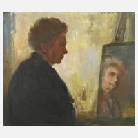 Brustbildnis der Künstlerin im Profil, ihr Bildnis im Spiegel betrachtend, minimal pastose Malerei in zurückhaltender Farbigkeit, Öl auf Leinwand, rechts oben signiert und datiert ”H. M. Böhme 1973”, rückseitig auf dem Rahmen in Blei betitelt und datiert ”Selbstbildnis mit Spiegel 1973” und Anschrift der Künstlerin ”Hildegard Böhme, 8027 Dresden, Ho-Chi-Min-Str. 79”, reinigungsbedürftig, original gerahmt, Falzmaße ca. 70,5 x 80,5 cm. Künstlerinfo: dt. Malerin und Graphikerin (1907 Dresden bis 1993 Dresden), zunächst Zeichenunterricht bei Simonson Castelli und Georg Oehme, studierte 1926–30 an der Akademie Dresden bei Richard Müller, Hermann Dittrich, Ferdinand Dorsch und Max Feldbauer, 1945 Zerstörung eines Großteils ihres bisherigen Schaffens bei der Zerstörung Dresdens, Mitglied des Verbandes Bildender Künstler (VBK) der DDR, freischaffend tätig in Dresden, Quelle: Vollmer, AKL, Eisold ”Künstler in der DDR” und Internet.