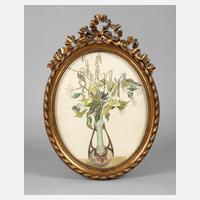 hochovaler Rahmen im Louis-Seize-Stil mit Perlstab und Schleifenbekrönung, Messingguss, 20. Jh., original beigefügt Aquarell mit Birkenreis in Jugendstilvase hinter Glas als Beigabe, Falzmaße ca. 32 x 26,5 cm.
