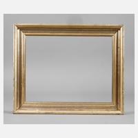 Rahmen aus ca. 12,5 cm breiter, steigend profilierter, mit Lorbeerstab, lesbischen Kymation und Eckkartuschen gestuckter und vergoldeter Holzleiste, Gehrungen über Eck gearbeitet, geringe Altersspuren, original beigefügt Ölgemälde auf Leinwand, mit sommerlicher Alpenlandschaft um 1870, als Beigabe, Falzmaße ca. 48,5 x 66,5 cm.
