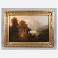 um 1920, Kirschbaum massiv, martelliert, als Spitzbogen gearbeiteter Rahmen mit geschnitzten Vertiefungen, rückseitig mit Kunsthandlungsetikett J. Gerhard Mainz, beigegeben Ölgemälde, monogrammiert A.G. (Adolf Gerhard), welches einen Sonnenaufgang über baumgesäumtem See zeigt, Altersspuren, Maße 40 x 32 cm.