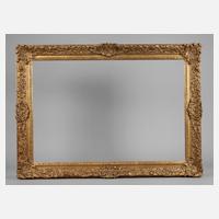 18./19. Jh., aus profilierter, gekehlter und gestuckter Holzleiste, über rotem Bolus ehemalige Blattvergoldung, später goldbronziert, Eckkartuschen mit Rocaillenmotiven und Akanthusblättern, Ecken geplattet, kleinere Erhaltungsmängel, restaurierungsbedürftig, Falzmaß H 19,5 x B 24,5, Gesamtmaß 35 H x B 40 cm.