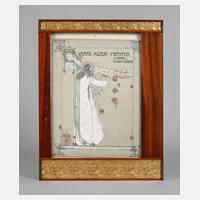 um 1900, Mahagoni massiv, asymmetrisch gestaltet, gestuckt und vergoldet, Friese mit rapportierenden liegenden Jugendstilmädchen unter Kastanienranken bzw. Fischen zwischen Seerosen mit Libellen, verglast, die Ecken mit Messingkanten verstärkt, darin beigegeben Buchtitel Jessie M. King – Werke Alte Meister – 1902, Stuck mit Altersrissen, sonst kleinere Altersmängel, Falzmaß 35 x 27, gesamt 45 x 36 cm.