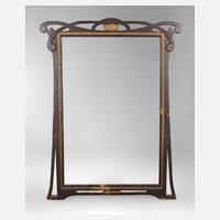 Spiegel gerahmt mit ca. 7,5 cm breiter, schlicht profilierter, braun-schwarz gelackter, partiell mit Jugendstilornamentik gestuckter und vergoldeter Holzleiste, Gehrungen geschnitten, Altersspuren, Falzmaße ca. 67 x 54 cm.