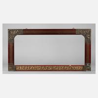 Rahmen aus ca. 6,5 cm breiten, schlicht profilierten, partiell rot gelackten und sparsam goldbronzierten Holzleisten, die Basisleiste mit vergoldetem, gestucktem Puttenfries verziert, die Gehrungen mit aus Messing getriebenen Jugendstilapplikationen überdeckt, Erhaltungsmängel, Falzmaße ca. 36,5 x 78,5 cm.