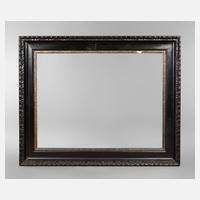 Rahmen aus ca. 13 cm breiter, steigend profilierter, ornamental gestuckter und schwarz-braun gelackter Holzleiste mit vergoldetem Inlay, Gehrungen geschnitten, Erhaltungsmängel, Falzmaße ca. 76,5 x 99,5 cm.