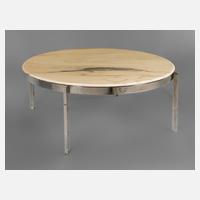 1970er Jahre, vierbeiniges Gestell aus verchromtem Stahl, runde originale Marmorplatte, normale Altersspuren, H 48 cm, D 120 cm.