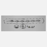 um 1970, Zinn, jeweils gestempelt Logeskovtin Denmark, bestehend aus ca. 88 mm langem Anhänger, an 58 cm langer Kette mit Federringverschluss und passendem Armreif von D max. 66 mm, jeweils besetzt mit zwei Glassteinen, leichte Tragespuren.