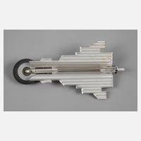Aluminium, Kunststoff und Stahl, rückseitig graviert, ligiertes Monogramm PM, datiert 27.10.85 und Bezeichnung Gold + Alu Stahl, leichte Altersspuren, Maße ca. 102 x 54 mm.