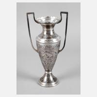 wohl Tula, um 1900, ungepunzt, Silber geprüft, handgetriebene, reich gravierte Vase, partiell geschwärzt, Fuß verschraubt, beidseitig Kartuschen mit Gitterdekor, darin Segelboote bei hohem Wellengang, alles gerahmt von Blüten- und Ornamentbändern, normale Altersspuren, H 30 cm, G ca. 635,9 g