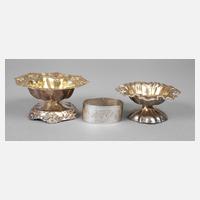 Moskau, Mitte 19. Jh., beide Salieren mit Silberstempel 84 Zolotniki und Stadtmarke Georg der Drachentöter für Moskau, eine mit Beschaumarke ”A.K” und kyrillischer Meisterpunze ”PG”, die andere mit Meisterpunze ”AA” in Schreibschrift, Silber innen vergoldet, fein getriebene Fußschalen, die Ränder ornamental beziehungsweise geometrisch reliefiert gestaltet, eine mit kleinem Loch, dazu ein Serviettenring, gestempelt 84 Zolotniki, kyrillische Meisterpunze AG und ein herzförmiger weiterer Stempel, graviertes Besitzermonogramm G, datiert 1933, H 4,5 und 5,5 cm, L 5,5 cm, G zusammen ca. 143 g.