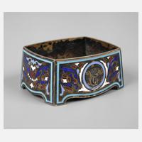 dat. 1896, Krönungsbecher für Zar Nikolaus II. und Zarin Alexandra Feodorowna, schlichter, konisch zulaufender Korpus, allseitig emailliert und partiell goldstaffiert, umlaufende Ornamentik in Flechtbandoptik, Front mit Doppelmonogr. N II A darunter Dat. im Oval, rs. Kartusche mit Wappen der Romanow, die Becher wurden in großer Stückzahl produziert und sollten als Geschenk anlässlich der Krönung an die Untertanen verschenkt werden, Altersspuren, Vergoldung berieben, H 10,5 cm.