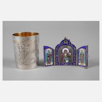 Ikone als Anhänger, datiert 1895, kyrillische Beschaumeistermarke LL und Meister HG, Silberstempel 84 Zolotniki, Stadtmarke Moskau Georg der Drachentöter, Silber fein graviert und emailliert, dazu ein Becher des Meisters Pyetr Abrosinov, Meister in Moskau 1869–1908, dieser innen vergoldet, schauseitig fein gravierte Landschaft mit Bauernhaus, beides in gutem Zustand, L 5 und 5,5 cm, G zusammen ca. 69,6 g.