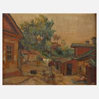 Blick in urwüchsige russische Dorflandschaft, pastose Malerei mit lockerem breiten Pinselduktus, Öl auf Karton, links unten kyrillisch signiert ”A. Pokrowski” und undeutlich russisch datiert ”9.(19)21 g.”, partiell Lackspuren, reinigungs- und etwas restaurierungsbedürftig, gerahmt, Falzmaße ca. 33 x 42 cm.