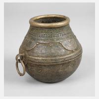 Benin, bekannt für die 1000-jährige Erfahrung in der Kunst der Gelbgussarbeiten, in der verlorenen Form gegossen, seitlicher Aufbewahrungsring, komplett verziert, auch am Boden, Oberfläche gedunkelt, besonders schönes Stück, H 11 cm.