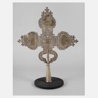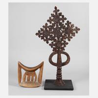 Äthiopien, 20. Jh., Kreuz aus fein beschnitztem Holz, in Nussbaum gefasst, unbedeutender Riss in einem Bogen, H 60 cm, B 35 cm, dazu geschnitzte Nackenstütze aus Teakholz, Maße 20 x 18 cm.