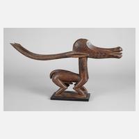 Mali, der Volksgruppe der Bambara zugeordnet, der Tanz mit diesen Aufsätzen soll die Fruchtbarkeit der Äcker sichern, braunes Tropenholz, komplett beschnitzt, Kopfstück am Hals mit zwei Klammern befestigt, nachträglich auf Plinthe montiert, sehr gutes, älteres Stück, H 30 cm, L 52 cm.