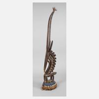 Mali 20. Jh., der Volksgruppe der Bambara zugeordnet, Holz fein beschnitzt, in Form einer männlichen Pferdeantilope, dieses ist das Stammestier der Bambara, dieser Aufsatz wird im Tji-Wara-Ritus verwendet, dieser ist der fünfte der sechs Initiationsriten der Bambara, der sich der Verbindung zum Kosmos annimmt und die Beziehung zum Ackerbau herstellt, das Unterteil besteht aus grobem Gewebe und geflochtenen Pflanzenfasern, umlaufend mit Kaurischnecken verziert, meisterhafte Arbeit, H ca. 100 cm.