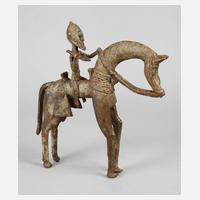Westafrika, der Volksgruppe der Dongan zugeordnet, in der verlorenen Form gegossen, Darstellung eines Reiters auf dem Pferd, mit Speer in der Hand, Pferd mit beidseitigen Satteltaschen, H 28 cm, L 26 cm.