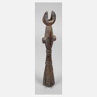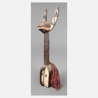 Mali 20. Jh., der Volksgruppe der Bambara zugeordnet, Holz fein beschnitzt, in Form einer weiblichen Pferdeantilope, auf dem Rücken eine kleine Antilope tragend, dieses ist das Stammestier der Bambara, dieser Aufsatz wird im Tji-Wara-Ritus verwendet, dieser ist der fünfte der sechs Initiationsriten der Bambara, der sich der Verbindung zum Kosmos annimmt und die Beziehung zum Ackerbau herstellt, das Unterteil besteht aus grobem Gewebe und geflochtenen Pflanzenfasern, umlaufend mit Kaurischnecken verziert, meisterhafte Arbeit, H ca. 100 cm.