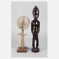 Mitte 20. Jh., Fruchtbarkeitspuppe der Ashanti aus Ghana, stark ausgebleicht, Halterung später hinzugefügt, H 35 cm, dazu stehende männliche Figur aus hartem, dunklem Bockholz, schwarz gefasst, mit hoher Frisur und schönen Stammestatauierungen, Farbfassung leicht berieben, H 47 cm.