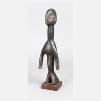 20. Jh., am Fuß altes Sammleretikett, in der verlorenen Form gegossen, Figur eines Kriegers mit Schwert, ähnelt stark den historische Plastiken der Jeba, ist jedoch deutlich kleiner, Bronzeguss wird am unteren Niger seit Hunderten von Jahren praktiziert, diese Fähigkeit blieb bis in die Neuzeit erhalten, Standplatte in einer Holzplinthe, H ca. 33 cm.